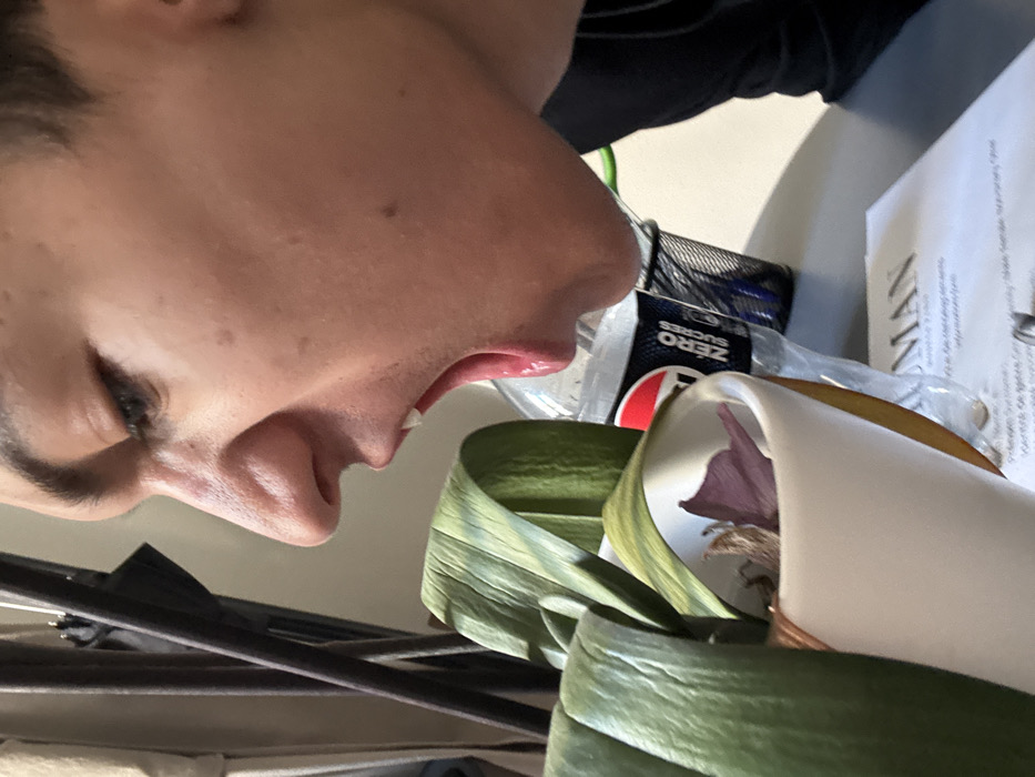 The scene depicts an indoor environment, identified as being within Paris, France, due to the presence of French language text "ZERO SUCRES" on a beverage bottle and other French words ("MAN", "information", "votre", "securité", "données", "votre identité") on a document. The image focuses on one individual, visible in profile from the mid-face to below the chin, positioned on the right side of the frame. The person has a light-to-medium skin tone, a prominent nose, and an open mouth revealing upper and lower teeth, directed downwards and to the left. A small portion of dark hair is visible at the top, and a dark garment is visible on the right. In the lower-left foreground is a potted plant, likely an orchid, with large, green, textured leaves. The plant is housed in a white pot, within which a dried, purplish petal or leaf is visible. On a light-colored surface, presumably a desk, to the right of the plant, a clear plastic bottle of Pepsi Zero Sugars (labeled "ZERO SUCRES") stands uncapped. Behind the bottle is a black mesh pen holder containing a blue writing instrument. Further right and partially obscured, a white document with black French text is visible, with the tip of a silver pen resting upon it. The background is indistinct, showing vertical dark elements and lighter surfaces, consistent with an interior room. No specific interactions are occurring, but the individual's open mouth is positioned in proximity to the plant.