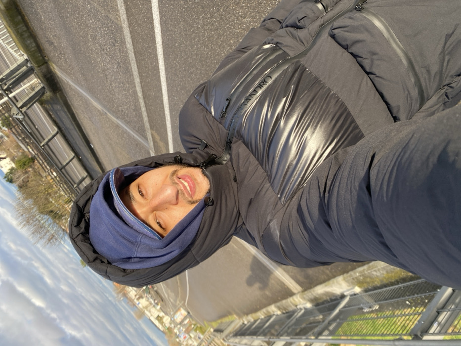 The image displays a close-up selfie of an adult male on an elevated asphalt structure in Hoenheim, France. The man, with a medium complexion, light beard, and smiling expression, is positioned centrally, looking directly at the camera. He is wearing a black hooded puffer jacket, featuring a shiny black panel on the upper chest with the word "Sandro" visibly embossed, and a blue baseball cap under the jacket's hood. The background shows an asphalt surface with white lane markings. To the left, a metal safety barrier runs along the edge of the structure, overlooking a lower area containing green ground cover, bare deciduous trees, and distant residential buildings. The sky is partly cloudy, illuminated by clear daylight, which casts distinct shadows on the asphalt.