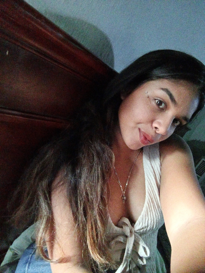 A female individual is depicted in a medium-shot portrait, positioned indoors and facing directly towards the camera with a slight head tilt to her right. She possesses long, dark brown hair with lighter brown strands, which cascades over her left shoulder and chest. Her dark eyes are directed forward, and a small, reflective stud is visible on her left cheekbone. Her lips are slightly parted, forming a subtle smile. She is wearing a light-colored, possibly beige or off-white, ribbed top with a V-neckline and a tied knot detail at the chest. A silver-colored chain necklace with a small pendant is visible around her neck. Below her top, a portion of blue denim fabric is visible. The background to the upper left features dark brown wooden furniture with horizontal molding. To the upper right and behind her head, a light blue wall is visible. A rectangular object with horizontal slats is partially observed on the far right. The image lacks discernible visual information to identify the specific location as the city of Altagracia, Venezuela.