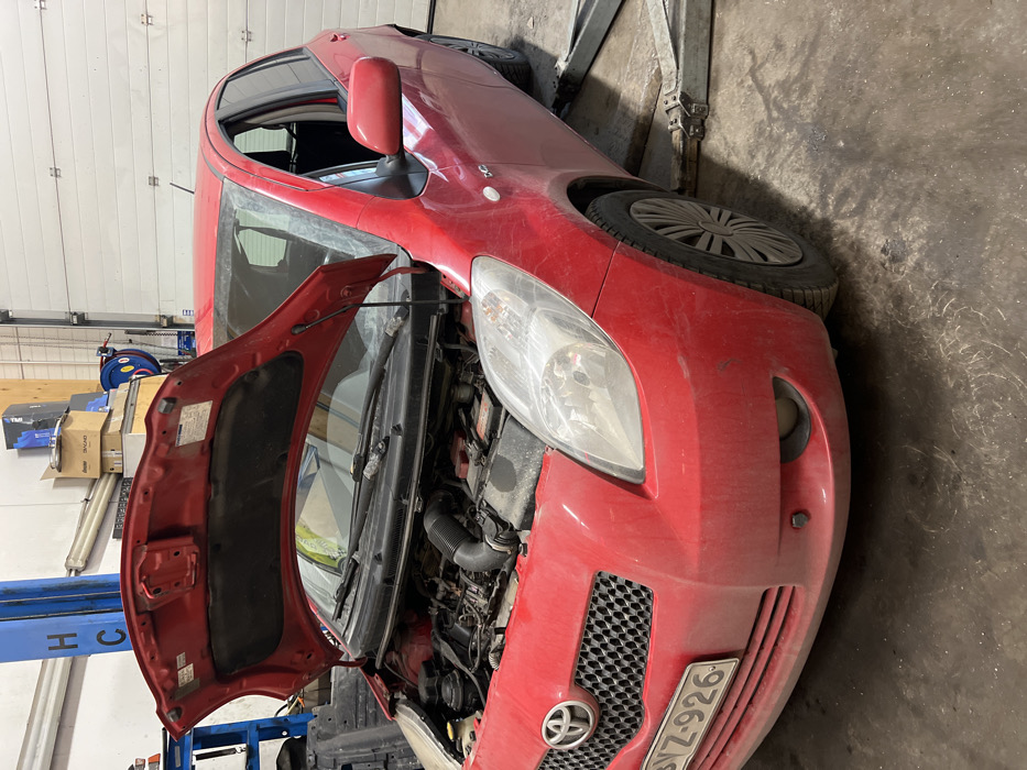 A red, second-generation Toyota Yaris hatchback, bearing Finnish license plate BYZ-926, is parked indoors within an automotive repair shop in Espoo, Finland