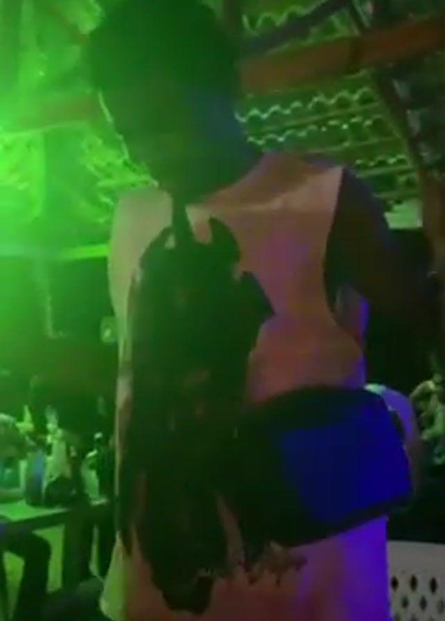 people dancing and socializing in a dimly lit indoor setting. Green lighting illuminates the space, casting a vibrant hue over the room. Tables are scattered around, cluttered with bottles and cups, suggesting a gathering or party. Several individuals can be seen dancing, while others are seated at the tables. The atmosphere appears lively and festive. The location appears to be in a thatched hut type structure.