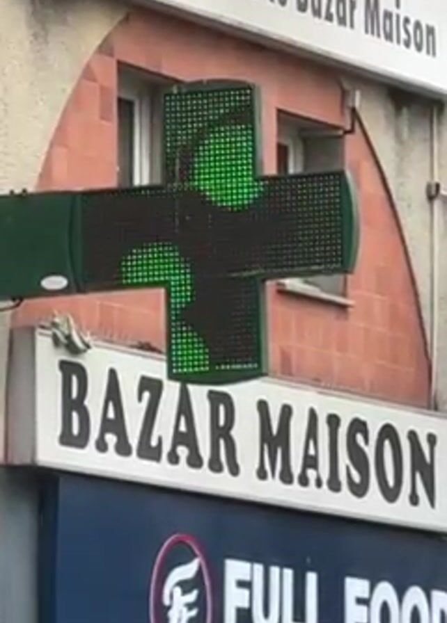green pharmacy sign with LEDs displaying animations and the word “PHARMACIEOPATHIE” in sequence. The sign is mounted above a shop sign reading “BAZAR MAISON.” Below “BAZAR MAISON,” a blue sign with the words “FULL FOOD” is visible. The video appears to be taken in an urban area.