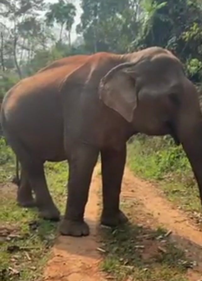 tan-colored elephant standing on a dirt road. It is daytime. The elephant is facing right and is actively eating by grabbing something with its trunk and placing it into its mouth. The road appears to be an unpaved path surrounded by green vegetation and trees, suggesting a natural or jungle-like environment. The lighting indicates a sunny day.