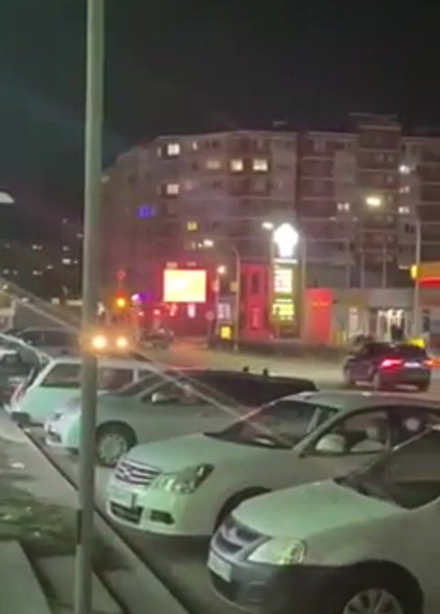 street scene at night. Several white cars are parked in a row along the curb. A tall apartment building is visible in the background with multiple lit windows. Streetlights illuminate the area. In the distance, there is a gas station with lit signs and cars driving on the road.