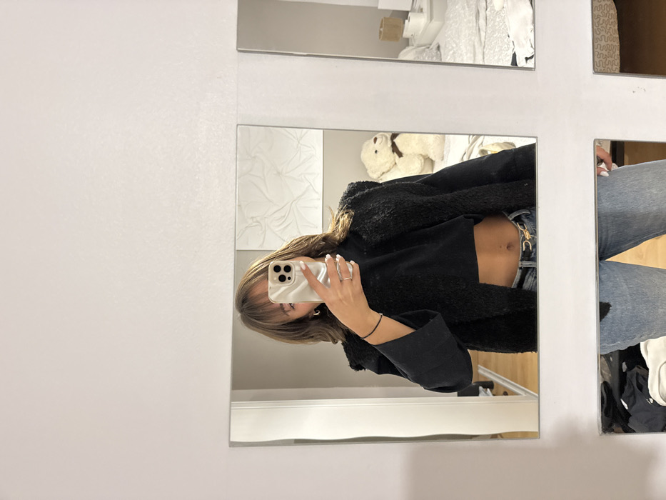 A woman is visible in a mirror, angled to show her reflection. She holds a phone, obscuring her face. She wears a black jacket over a crop top, exposing her midriff. Blue jeans are also visible. The mirror is part of a larger display of mirrors, showing a glimpse of a room including a white wall, a textured artwork, and a teddy bear. The composition is portrait, oriented slightly to the side.