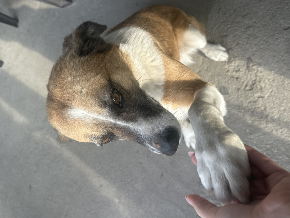 In the city of Semchinovo, Bulgaria, a medium-sized dog with a fawn-brown coat, white chest and underbelly, and a prominent white blaze extending from its forehead down its dark muzzle, is depicted in an outdoor setting. Its amber-brown eyes are directed towards the lower left of the frame. The dog's right front paw is positioned within an open human hand, which exhibits light skin tone and lightly polished fingernails. The animal's stance suggests it is either sitting or slightly raised, with its lower body partially visible. The scene is illuminated by direct sunlight, casting distinct shadows on the light gray concrete or paved surface. Faint, dark, vertical elements in the upper right background suggest blurred furniture or structures.