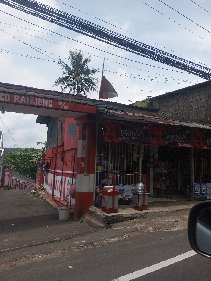 This image, located in the city of Chori, Nigeria, presents a street-level view of a commercial area under a partly cloudy sky. The scene is dominated by a two-story structure, primarily painted red and white, with a corrugated metal roof showing signs of rust. An archway extends from the left side of this building, displaying the text "CO RANJENG 01/05" in white lettering on a red background. Above the shop section, a flagpole displays a red and white horizontal bicolor flag. The building's ground floor appears to be a shop or kiosk, secured by vertical metal bars. Multiple banners advertising "PRIMA" and "BARU" with a price of "15.000" are strung across the shop's facade. Various packaged goods are visible inside. A single individual, wearing dark clothing and a head covering, sits on a concrete ledge outside the shop. They are positioned behind two red-framed portable stalls. One stall holds a large transparent water dispenser bottle, and the other contains a metal steaming pot. Two white plastic buckets rest on the ground near the building's corner. The building's side wall features painted numbers "17," "08," and "45" in black on a white background. To the left of the building, a paved road slopes downward, revealing a series of descending terraces or steps with red and white railings, leading into an area densely covered with green trees. A tall palm tree is visible in the background, towering above the buildings. The foreground shows a section of asphalt road with a white demarcation line, and the edge of a dark vehicle's rearview mirror is visible on the far right, suggesting the photograph was taken from within a vehicle. Overhead, numerous electrical or utility wires crisscross against the sky.