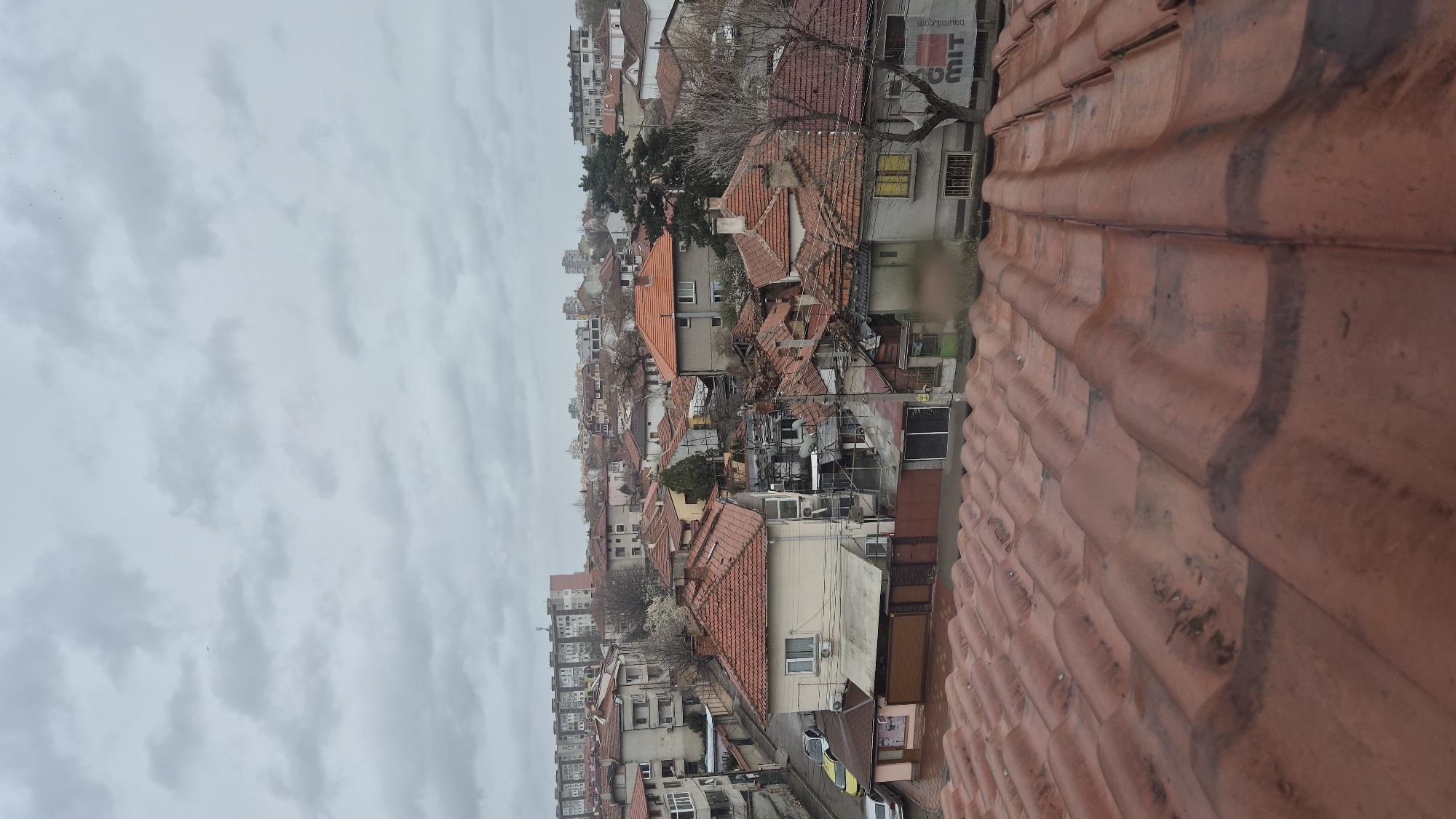 view from a high vantage point, likely a rooftop, in a densely built urban area. The location is Sliven, Bulgaria, as evidenced by distinct architectural styles, building materials, and signage in Bulgarian. The foreground is dominated by red clay roof tiles, extending into the lower right of the frame. Beyond the rooftop, the scene transitions to a panorama of closely packed buildings, primarily residential. These structures exhibit a mix of architectural designs, ranging from older, smaller houses with red-tiled roofs to taller, multi-story apartment buildings. The buildings appear to be constructed from various materials, including brick, concrete, and plaster. Some buildings are in a state of disrepair, with visible signs of weathering and age. Scaffolding can be seen around one of the buildings, indicating ongoing construction or renovation. Numerous satellite dishes and air conditioning units are attached to the buildings, typical for urban areas. A street runs between some of the buildings with parked cars visible along the road. The sky is overcast and gray, indicative of cloudy weather conditions.