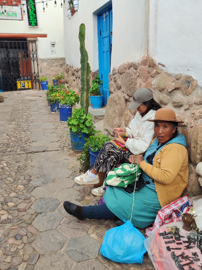 - "Two women are seated on a cobblestone street in Cuzco, Peru, against the stone and whitewashed wall of a building" by FM-20kwN2, licensed under CC BY 4.0