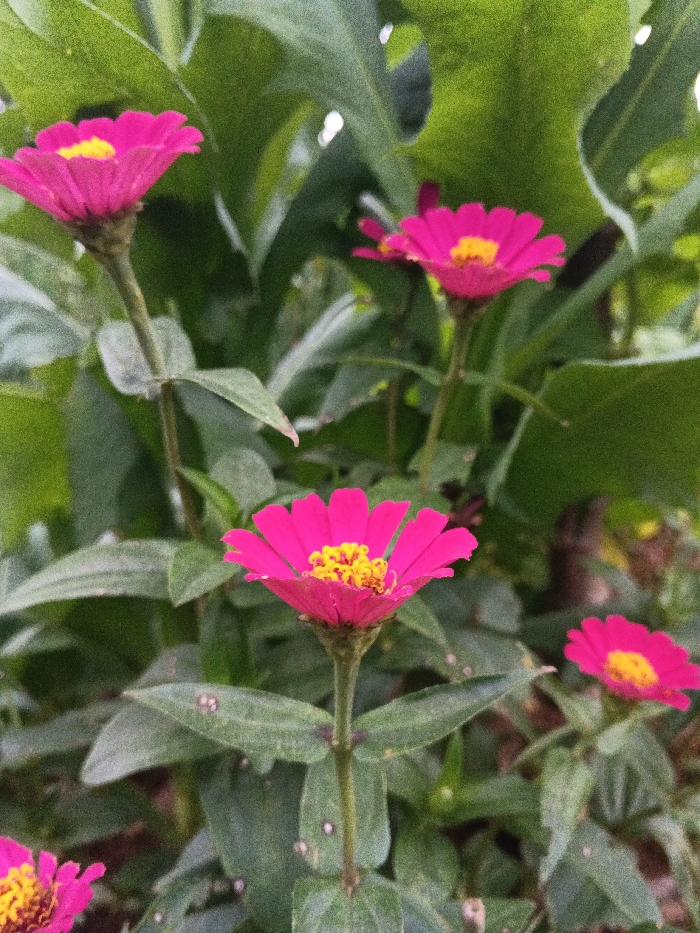 The image features several vibrant pink zinnias with bright yellow centers. They stand amidst lush green foliage, the leaves providing a backdrop that accentuates the flowers' vivid colors. The blooms are in various stages of opening, with some facing the camera directly and others angled away. The scene is captured in natural light, giving it a lively and fresh appearance.