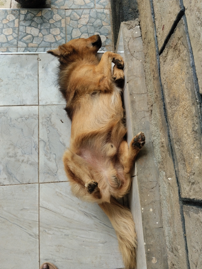 - "An adult male dog with tan and dark brown fur is depicted lying on its back, belly exposed, with all four paws curled inwards, resting on a tiled surface in Mahiakalo ward, Kenya" by FM-ceYJN2, licensed under CC BY 4.0