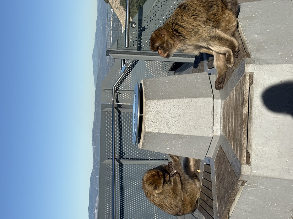 - "Two Barbary macaques are positioned on an outdoor viewing platform at the Upper Rock Nature Reserve, Gibraltar, Gibraltar" by FM-E1hwL2, licensed under CC BY 4.0