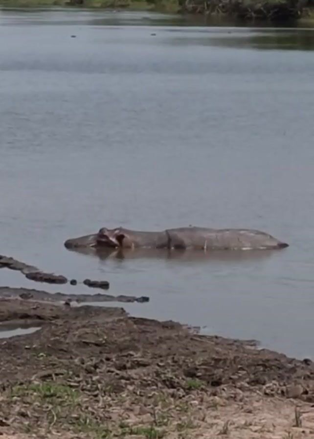 hippopotamus submerged in a body of water near a muddy shoreline. The hippo's head and back are visible above the water's surface. The background includes a dense green treeline. The environment appears to be a natural setting, possibly a lake or river within a wildlife reserve. The video suggests a tranquil observation of the animal in its natural habitat.