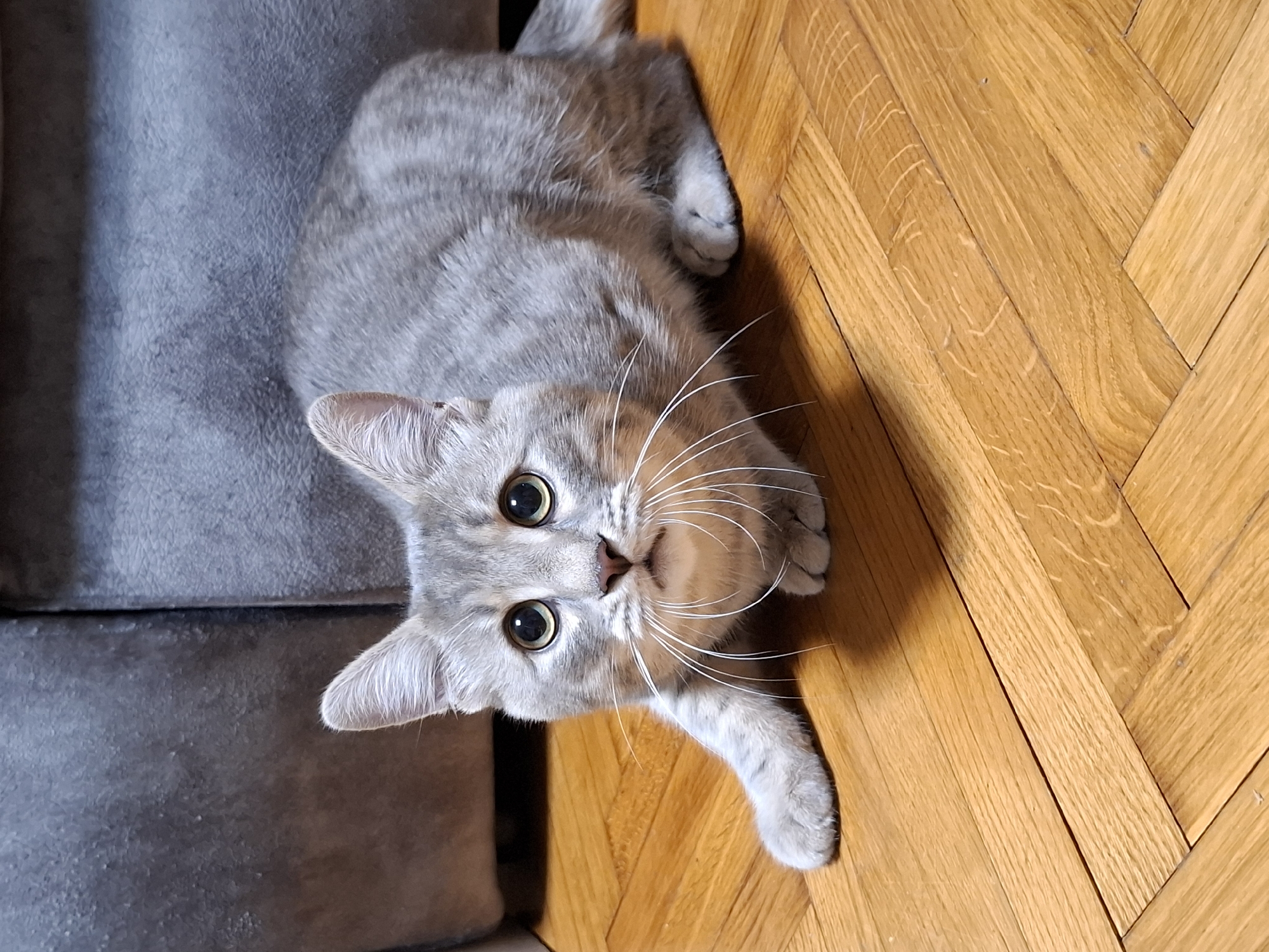 A grey tabby cat with green eyes lies on a grey sofa and a wooden floor in a herringbone pattern. The cat is looking up at the camera with its head tilted. The location is Novi Sad, Serbia based on other visual data and geolocation clues.