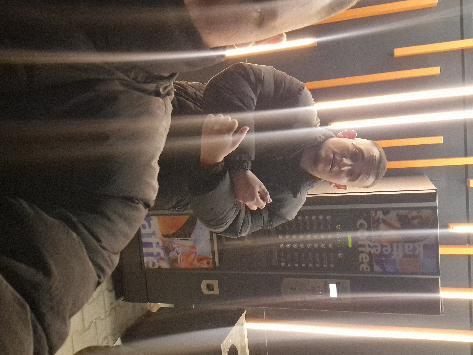 This image, located in Stara Zagora, Bulgaria, captures a scene primarily focused on one male subject in the midground. This individual, estimated to be in his 20s or 30s, has a short buzz cut and wears a dark, possibly black, puffy winter jacket over a dark garment. His hands are clasped together at his waist, and he looks directly towards the camera. To his right stands a dark-colored vending machine featuring "Kaffee" and "coffee" text, promotional images of individuals, multiple selection buttons, and a small, illuminated display screen. The background consists of a dark wall adorned with vertical orange and bright white illuminated strips. In the immediate foreground, obscuring the lower-left portion of the frame, is the partial view of another person's head (the back and right ear visible) and shoulder, also clad in a dark, puffy jacket. A dark, square-shaped trash receptacle is partially visible on the far right. The ground is surfaced with light-colored interlocking paving stones. The scene is artificially lit, with prominent vertical light sources generating lens flares.