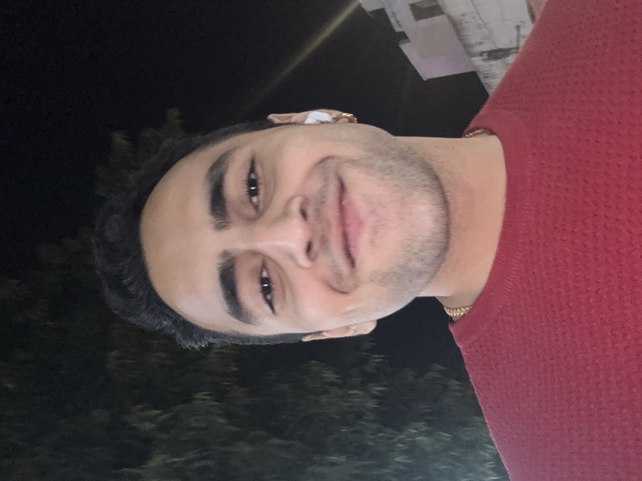 A close-up, front-facing portrait of an adult male is captured at night in the city of Jaipur, India. The individual, appearing in his twenties or thirties, has short, dark hair, dark eyes, and a light stubble beard. He is smiling directly at the camera, exhibiting dimples on both cheeks. He wears a red, textured long-sleeved garment and a gold chain around his neck. A white wireless earbud is present in his right ear, accompanied by a small gold hoop earring. The background is predominantly dark, featuring blurred dark green foliage on the left side of the frame. On the right, a segment of a light-colored building or wall, displaying blocky structural elements, is partially visible and faintly illuminated. The subject is brightly lit by a frontal light source, contrasting with the dim background environment.