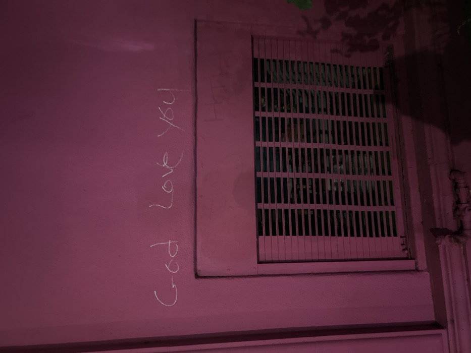 A pink wall features a message scrawled in white: "God love you