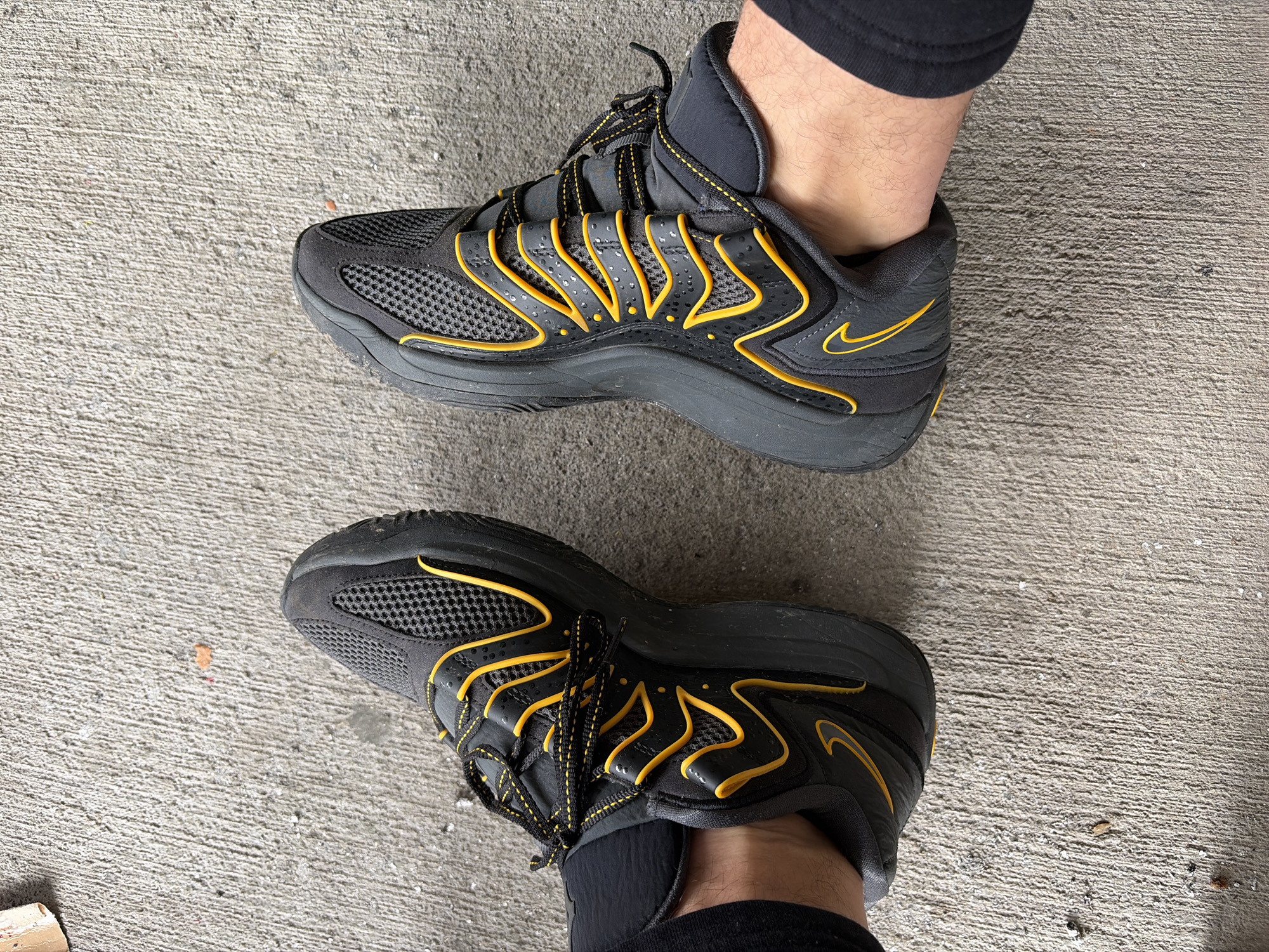 pair of black Nike sneakers with yellow accents on a concrete surface