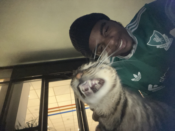 The scene depicts an individual taking a selfie with a domestic cat in an indoor or semi-indoor setting within the city of Jiangjin, China. One male individual with dark skin is visible in the upper right portion of the frame. He is wearing a black knit beanie and a green short-sleeved athletic shirt with white stripes on the shoulders. The shirt features an Adidas trefoil logo on the left chest and a crest emblem on the right chest, identifiable as "LIVERPOOL FOOTBALL CLUB" with "1904" inscribed. He is smiling broadly, directly facing the camera. In the lower-left foreground, a tabby cat is positioned close to the individual. The cat has brown, black, and tan striped fur. Its mouth is wide open, exposing its teeth, including prominent canines and incisors. Its whiskers are blurred due to apparent motion. The cat's body is partially visible against the individual's green shirt. The background consists of a light-colored ceiling overhead. Below the ceiling, large glass panels framed in a dark material are visible. Through these glass panels, an interior space with illuminated, light-colored walls or ceilings and distinct horizontal stripes of red, orange, and blue can be observed. Faint outlines of indoor plants are visible behind the glass in the lower-left background. The overall lighting suggests an indoor or well-lit area.