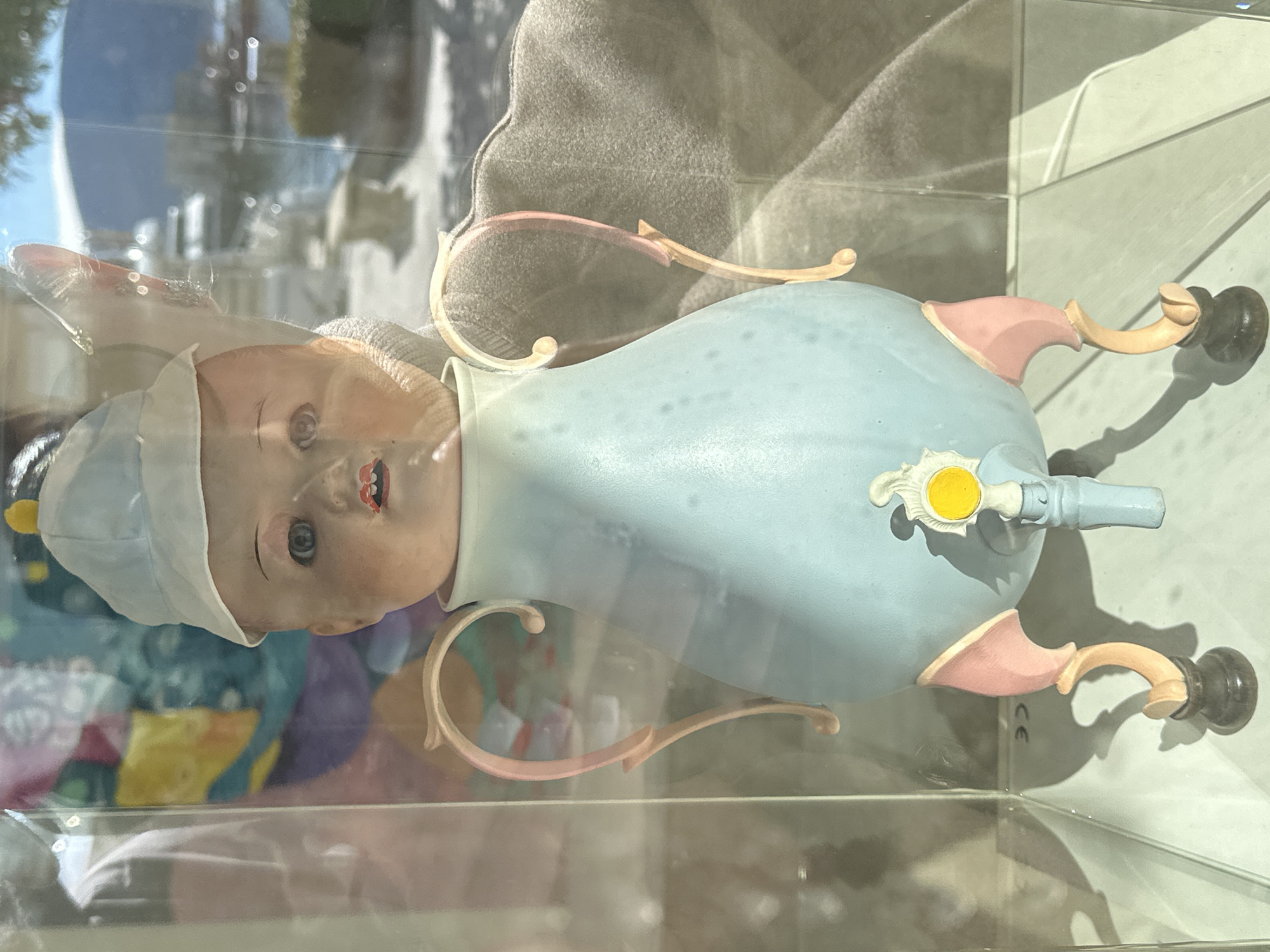 vintage doll-teapot hybrid displayed in a glass case, likely in a shop or exhibit in Tivat, Montenegro