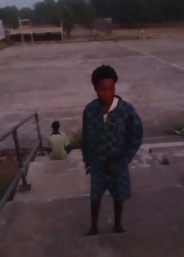 young person standing on concrete steps outside, with a partially visible person sitting a few steps below. The standing individual is wearing a blue patterned outfit. In the background is a large concrete area that resembles a sports court. Trees are also visible in the distance under an overcast sky.