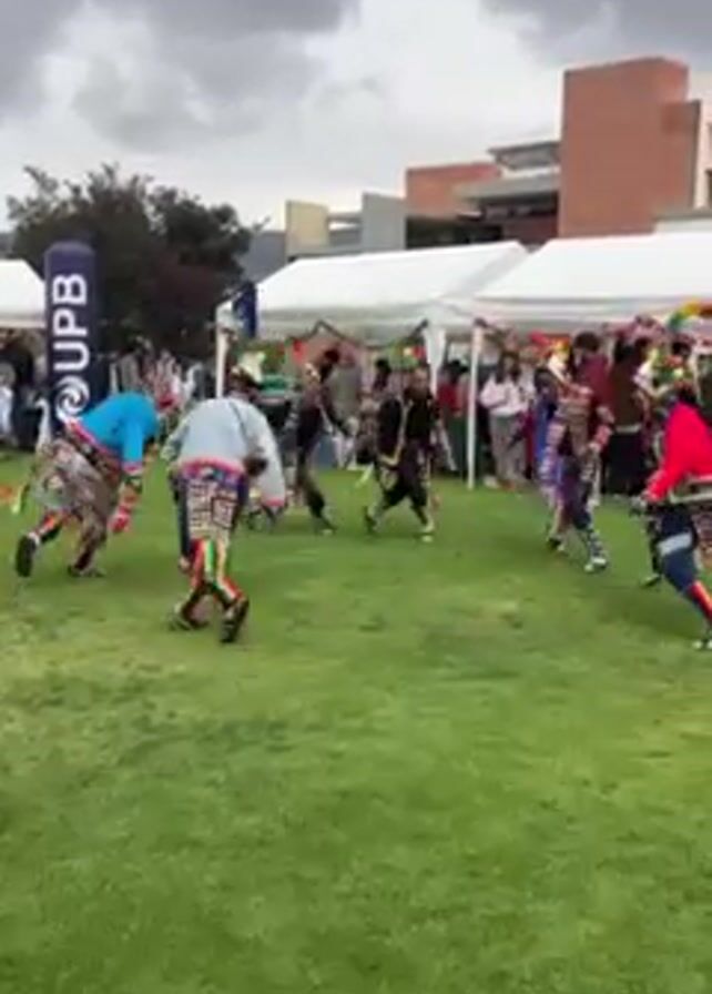 Several dancers in colorful costumes perform on a grassy field. Each wears distinct clothing, including vibrant stripes and headgear. They move with rhythmic energy, their steps coordinated. Behind them, a crowd of spectators watches, lining the periphery of white tents. A large UPB banner stands at the edge of the field. The scene is set on a cloudy day, with a university building in the background.