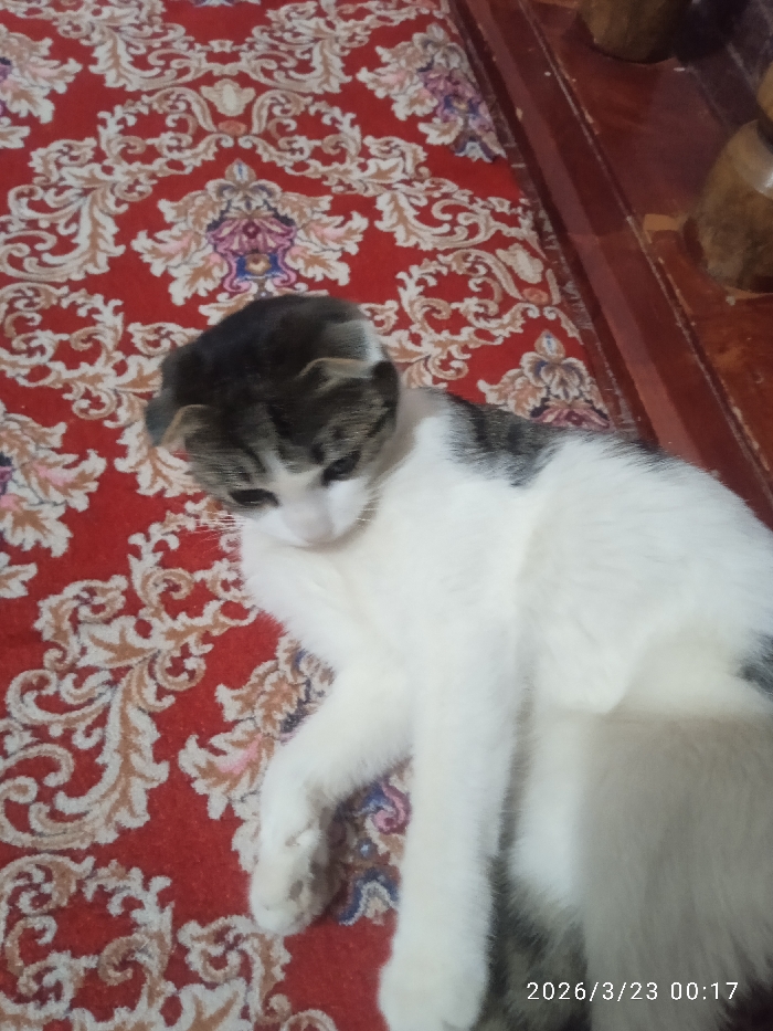 A domestic cat is observed lying on a red carpet with an ornate cream, gold, and dark blue pattern, located indoors in Khujayli, Uzbekistan. The cat possesses a predominantly white body with distinct dark grey tabby markings on its head and upper back. Its ears are partially folded, and its eyes are directed downwards towards its chest. The cat's front paws are extended forward on the carpet. A wooden object, possibly part of furniture, is partially visible in the upper right portion of the frame. The image is timestamped 2026/3/23 00:17 in the lower right corner.