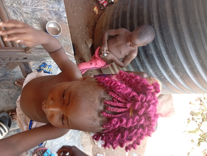 A top-down shot displays two children near a corrugated metal structure. The child in the foreground features pink braided hair and faces the camera. Another child, shirtless and wearing pink pants, sits near the metal structure. One hand is visible, and the child is looking downward. A small bowl sits on a tiled surface in the background. The child's feet are visible in a pair of sandals.