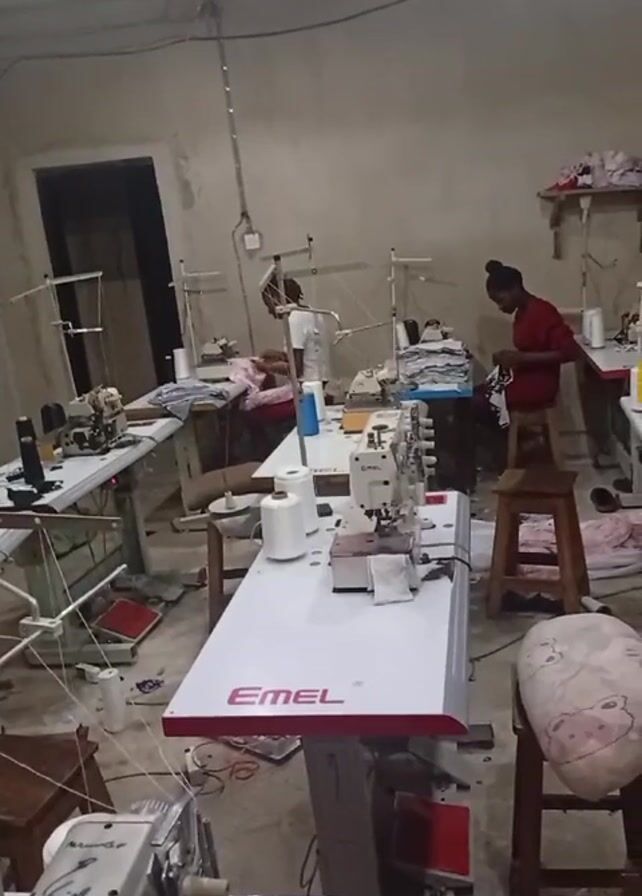 interior of a sewing workshop. There are several sewing machines placed on white tables throughout the room, some with white thread spools on them. One table in the foreground has "EMEL" printed on it. Two people are present. One person is standing at a sewing machine wearing a white shirt. The other person, wearing a red shirt and with their hair in a bun, is working at another sewing machine while seated on a wooden stool. A ceiling fan is visible above. The room appears somewhat cluttered.
