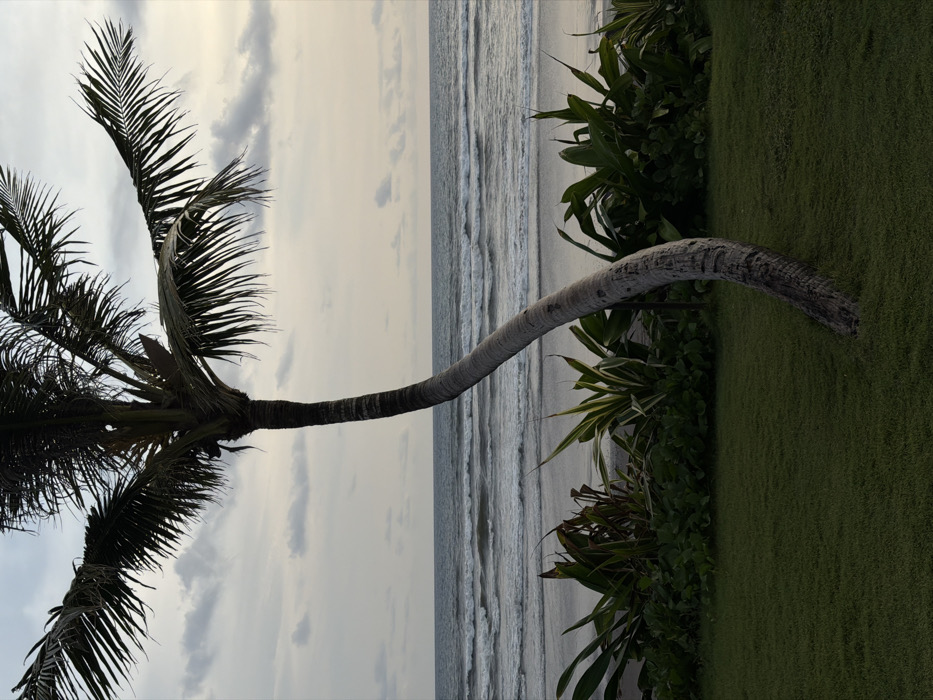 The scene depicts a coastal landscape in Belalang, Indonesia, under diffused, overcast lighting. A prominent palm tree with a notably curved, light-colored trunk occupies the central frame, extending from the lower foreground upwards, its dark green fronds partially visible at the top. The immediate foreground consists of a dark green, manicured grass lawn. A dense band of tropical foliage, comprising various broad-leafed plants, separates the grass from a sandy beach. Beyond the beach, the ocean displays multiple lines of breaking white-capped waves extending to the horizon. The sky is predominantly covered by grey and white clouds. No human subjects, animals, or artificial structures are present within the visible area.
