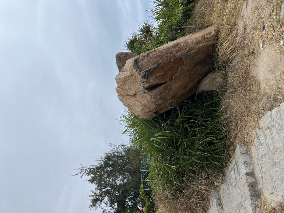 A large, multi-faceted rock sits amongst tall green grass, dry brown grass, and smaller green leafy plants. The sky is overcast and gray. A thin tree with dark leaves is visible at the bottom left. A stone path is visible at the bottom right, partially obscured by dry grass. The rock has a dark crevice.