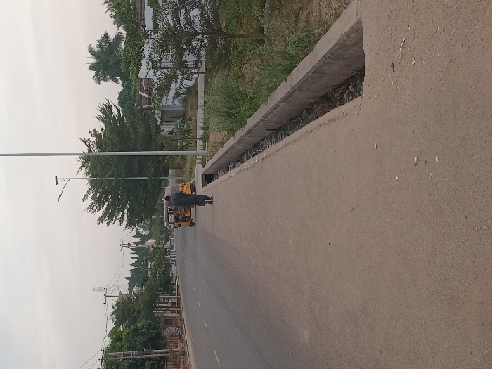 A street view shows a man riding a yellow tricycle on a wide, paved road. To the right is a concrete barrier separating the road from a grassy area. Trees line the left side of the road, with utility poles visible in the distance. A tall light pole stands near the man. The sky is overcast, creating a muted light. The overall scene suggests a suburban or developing area.