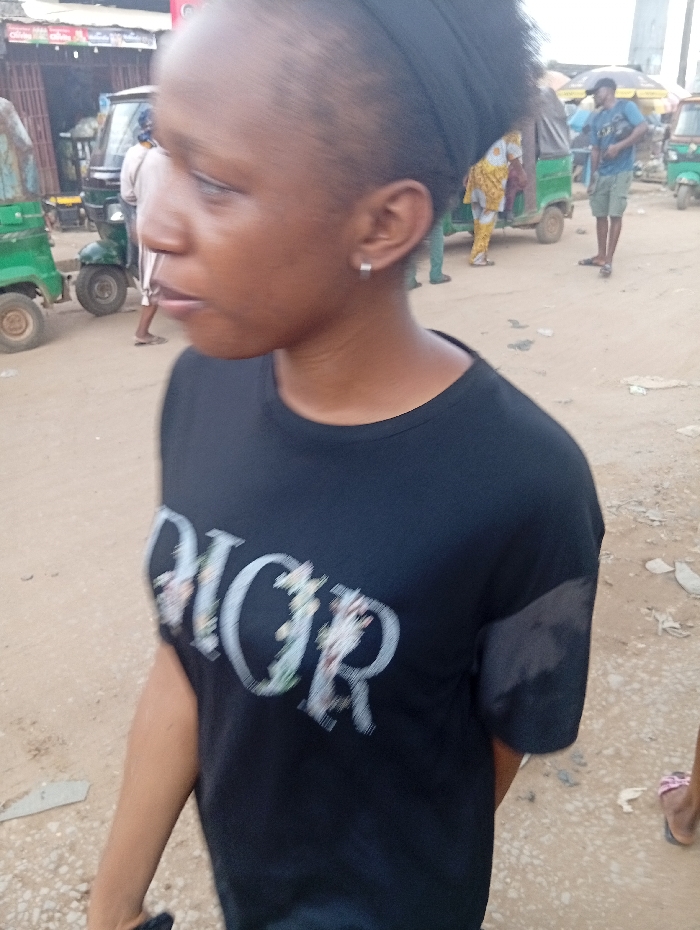 A young woman wearing a black Dior t-shirt stands outdoors. Her hair is pulled back, revealing a small earring. Behind her, three-wheeled vehicles and pedestrians populate the street. The ground appears to be dirt or sand. The lighting is somewhat harsh, possibly indicating a sunny day. The overall setting appears to be an urban area in a warm climate.