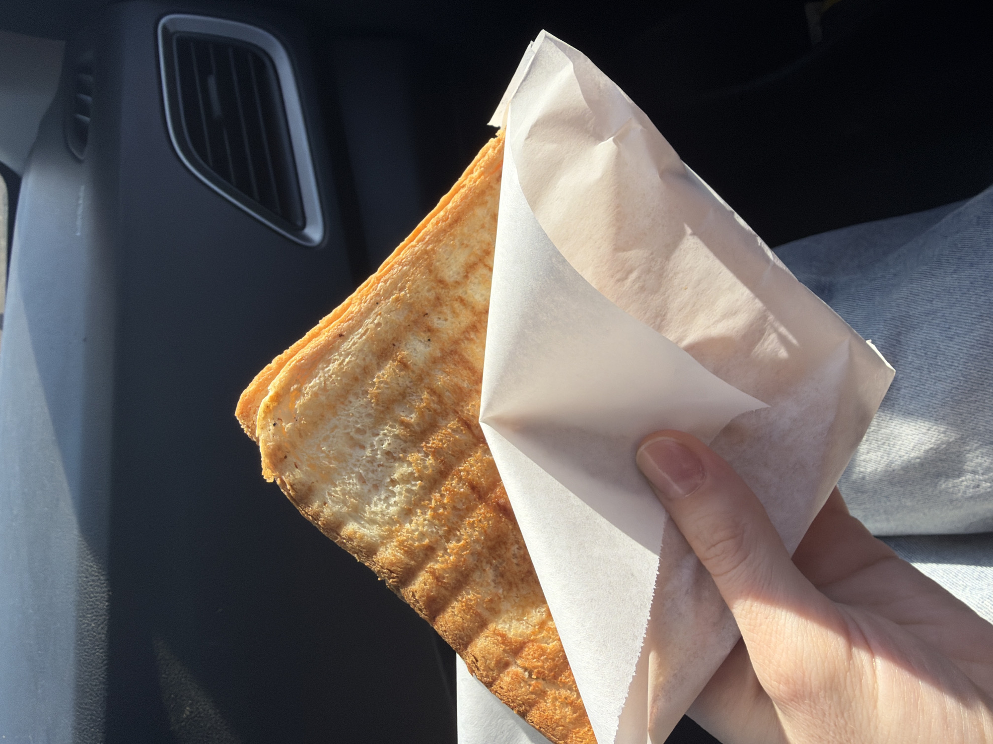 A sandwich in a white paper wrapper is held in a person's hand, inside of a car. The sandwich is likely grilled, as evidenced by the grill marks. Part of the interior car panel, including the air vent, and the passenger's jeans are also visible. The location is not specified, and there is no indication that the image was taken in the city of Chaikovsky, Russia.