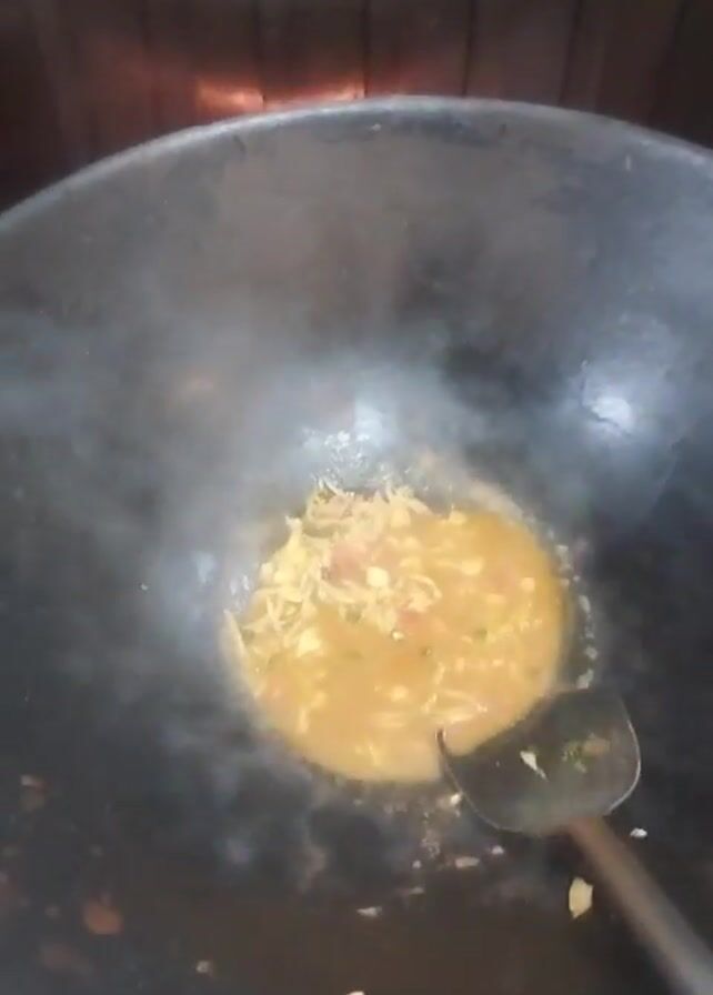 A cooking scene unfolds with a large, black wok taking center stage. Inside the wok, a bubbling mixture of noodles and what appears to be sauce is being stirred with a metal spatula. Steam rises, indicating heat, and the contents of the wok seem to be cooking. The person holding the spatula is visible only by their hand and arm. To the side of the wok, on a nearby shelf, are various containers, including bottles of soy sauce, chili sauce, and other condiments. The background indicates the cooking is taking place in a commercial kitchen or food stall setting.