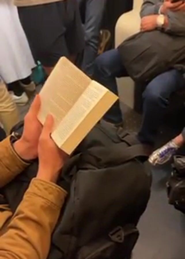 person reading a book on a crowded train