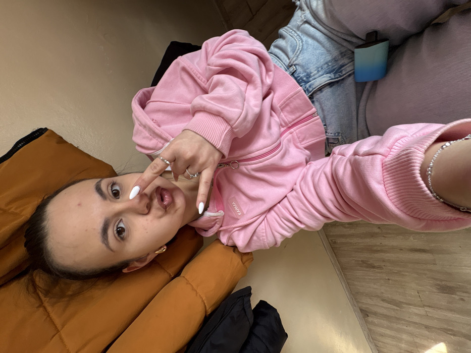 A young female is depicted in an indoor setting, positioned on a light-colored wooden floor with a plain beige wall in the background. Her dark hair is pulled back, revealing a high bun. She has dark eyes, light eyebrows, and minor blemishes on her forehead. She is looking directly at the camera with her lips pursed, forming a "duck face." Her left hand is raised, with the index and middle fingers extended in a V-shape, indicative of a peace sign. Both her visible fingernails are long and white. Multiple silver-toned rings adorn her left hand's fingers. A small gold-colored hoop earring is visible in her left ear. She is wearing a pink cropped zip-up hoodie with "KARMA" written on a small label on the left chest area, and light blue distressed denim jeans. A silver-toned bracelet is present on her right wrist. To her left, a folded or hanging dark orange/tan puffer jacket is partially visible, with a black garment underneath it. A small blue and light blue ombre object, possibly an electronic device, is tucked into the waistband area of her jeans on the right side. The specific location within Pernik, Bulgaria, cannot be determined from the visual information provided.