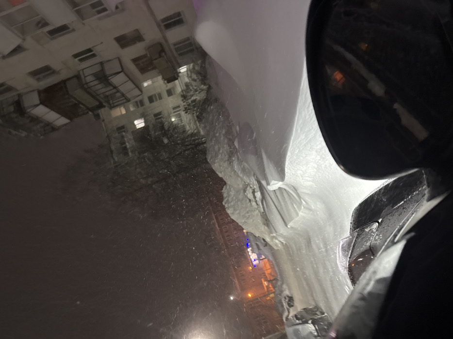 car's side mirror and a car buried in a snowdrift. A multi-story building is visible in the background, possibly an apartment complex. It appears to be nighttime, with streetlights providing some illumination. Snow is falling, obscuring visibility and covering the ground. The scene suggests a heavy snowfall event, significantly impacting transportation and urban life. The perspective seems to be from inside another vehicle.