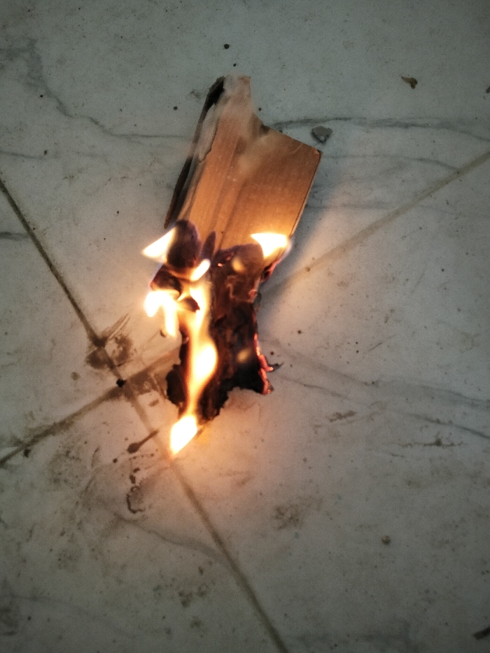 A small, rectangular piece of wood burns intensely on a light gray, tile floor
