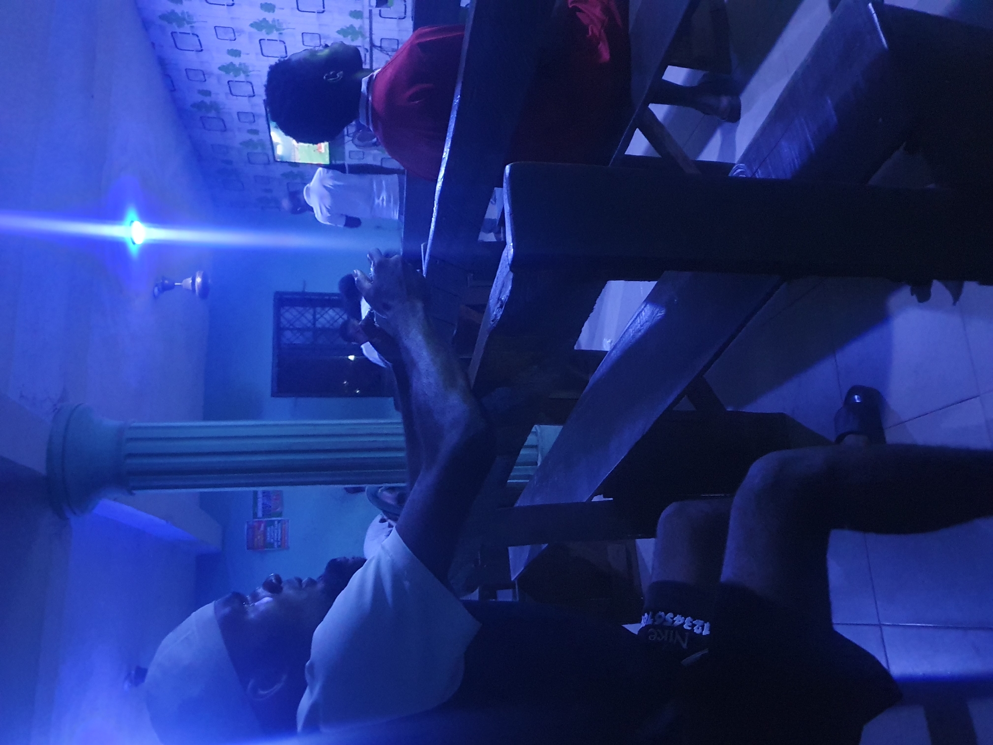 The image depicts an indoor communal viewing area in Lokoja, Nigeria, bathed in a pervasive blue light from a ceiling fixture