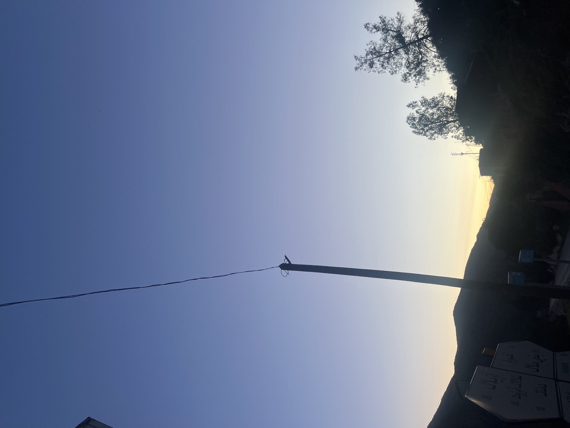 scene at sunset in Bin El Ouidane, Morocco. The sky is transitioning from blue to a lighter shade near the horizon. A utility pole is visible in the foreground with a wire extending across the sky. In the background, there is a dark silhouette of a mountain ridge and trees. Road signs with Arabic writing are also visible in the lower right corner of the image.