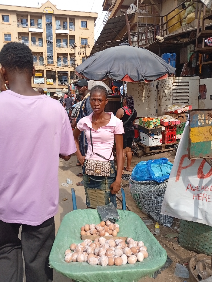 A woman in a pink shirt stands behind a green wheelbarrow filled with eggs at an outdoor market. She has a purse and is looking towards the camera. A man in a pink shirt is partially visible in the foreground. Other people and market stalls are visible in the background, along with a building with multiple floors. The market appears busy and crowded.