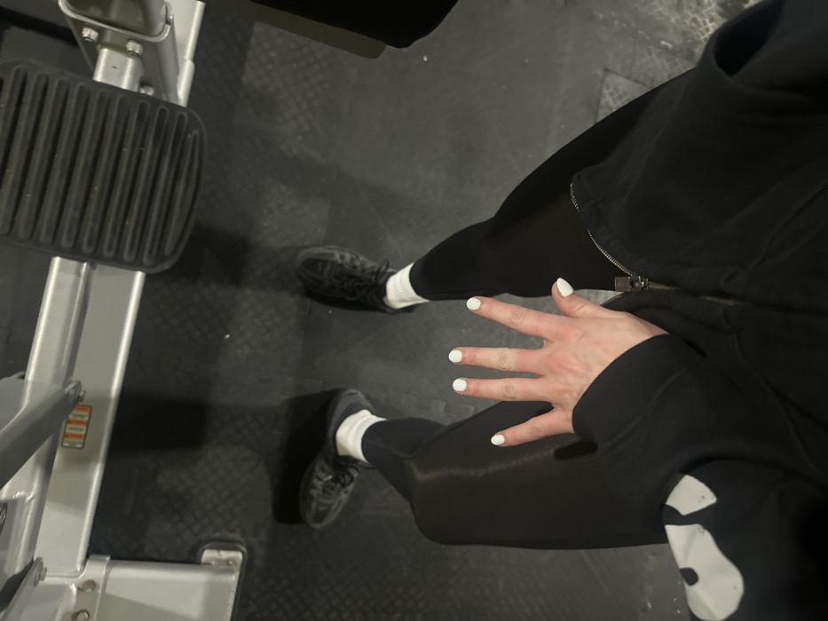 A top-down shot reveals a person at the gym, clad in black leggings and a zip-up hoodie with a white graphic on the sleeve. Their hand, with white-painted nails, is outstretched. The person wears white socks with dark-colored sneakers. A piece of gym equipment, featuring a grated foot platform, is visible in the frame's lower left corner. The background consists of a black, textured gym floor.