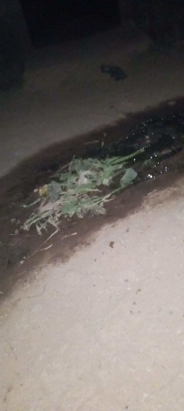 This image depicts a low-light scene on an outdoor ground surface in Afaka, Nigeria. The foreground consists of a light-colored, granular surface, likely concrete or packed dirt. Running across the midground, diagonally from left to right, is an irregular accumulation of dark, viscous liquid, possibly stagnant water or waste, exhibiting some reflectivity. Submerged and floating within this liquid are numerous fragments of green plant matter, including leaves and stems, mixed with smaller, lighter debris. The background is largely obscured by darkness, with indistinct shapes suggesting a darker wall or structure to the upper left and faint, dark debris visible in the upper right. No individuals, animals, or explicit interactions are present in the scene.