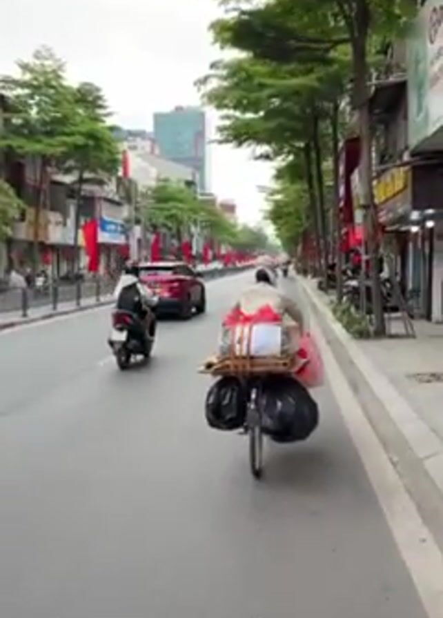 street scene in what appears to be a city in Vietnam. A person on a bicycle laden with goods, including two large black bags, is traveling down the street. The street is lined with trees and buildings, and red flags adorn the street lamps. A red SUV and a motorbike are traveling in the same direction as the cyclist. Another person, partially visible, is walking on the sidewalk in the foreground. The sky is overcast.