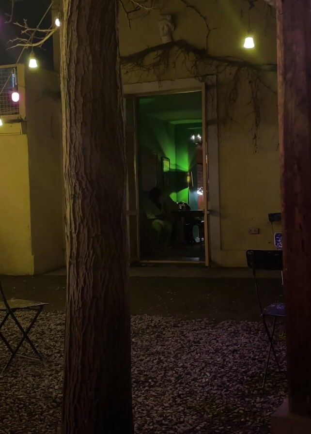 n outdoor patio area at night, possibly a cafe or restaurant. A tree trunk is in the foreground, partially obscuring the view. Behind the tree, there is an open doorway leading into a room with green lighting. Two figures are visible inside the room, sitting at a table. Above the doorway, there is a decorative architectural feature. The patio area is covered in small gravel, and there are several chairs and tables visible. String lights are hung in the background, providing illumination. The scene appears calm and relaxed, possibly a gathering spot for people to socialize.