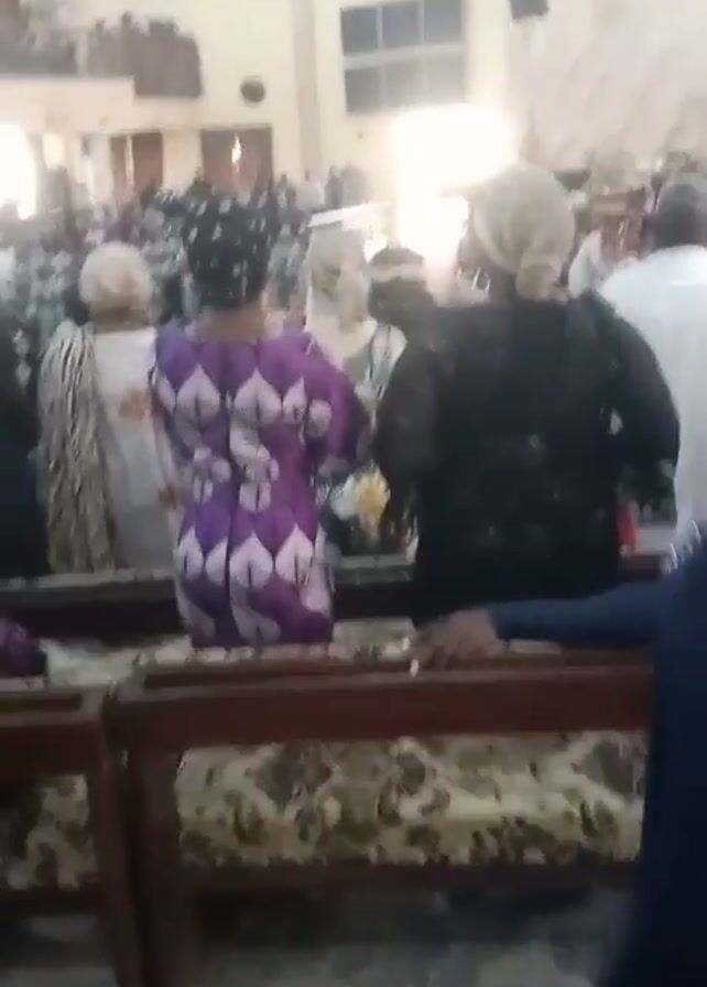 From an eye-level perspective inside a crowded church, the camera captures a multitude of people in the midst of a service. The congregation is diverse, with people wearing a variety of attire including traditional patterned fabrics, suits, and head coverings. Pews fill the foreground of the shot. The church is large and well-lit, with a balcony visible in the background, also populated with attendees. A screen displaying text is visible above and behind the main congregation, indicating a modern adaptation within the traditional setting. The camera person turns to capture a broad view of the large gathering. The atmosphere seems active, with some movement and apparent excitement in the air.