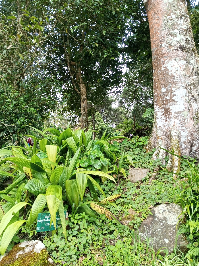 This image depicts a section of a lush botanical garden or natural area in Pachmarhi, India. The scene is dominated by dense green foliage under a canopy of trees. On the far right, a large tree trunk with light-colored, mottled bark featuring white and grey patches rises vertically. To the left of this tree, the ground slopes gently upwards, covered in various green groundcover plants and scattered rocks. In the mid-ground and foreground, a prominent cluster of broad-leafed, light-green plants with distinct vertical venation occupies the left side. Partially obscured among these plants in the lower-left foreground is a small green rectangular sign, likely a botanical label, with faintly visible text including "Malaxis capitu..." and "I.L.73." Behind this cluster and extending into the background are numerous other trees and shrubs with varying shades of green leaves, creating a dense forest-like environment. The lighting suggests an overcast day or dappled shade. No human figures are clearly visible.