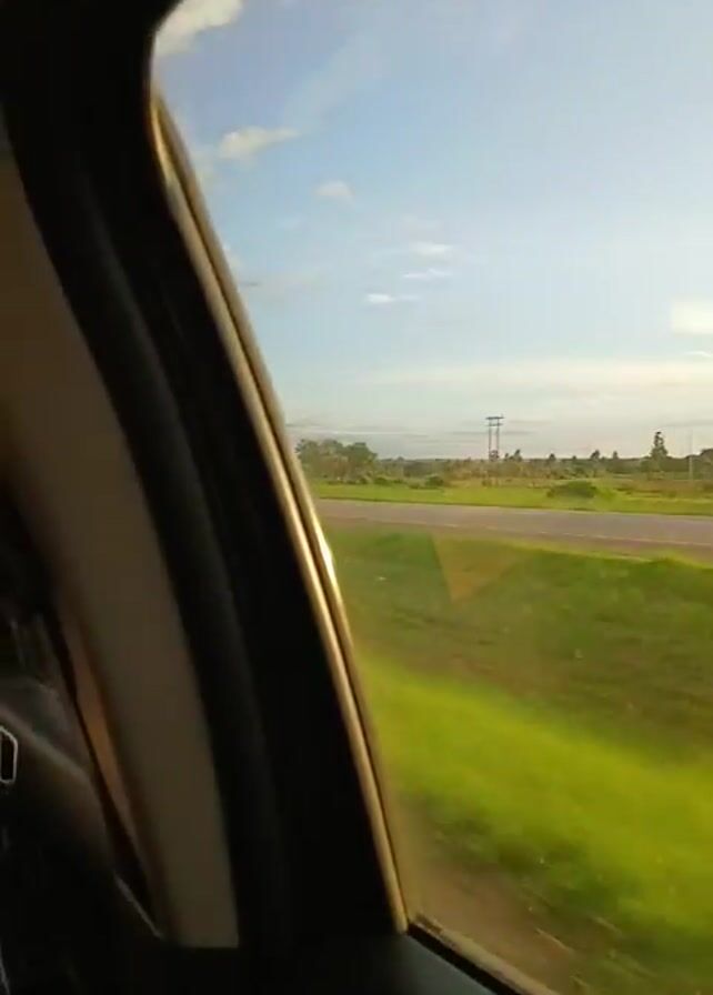 interior of a car driving down a road. Initially, the view is from the passenger side, showing a green field alongside the road with a blue sky and scattered clouds in the background. Then, the perspective switches to the back seat, focusing on the headrest and side window. The view shifts to show the driver, a person with curly hair, behind the wheel of a Mazda BT-50. The camera continues to record the car's interior and the view of the road through the windshield. The video ends with another shot from the back seat, showing the side window and passing scenery.
