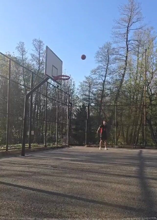 person playing basketball on an outdoor court. The person is wearing dark clothing and is in the process of shooting the basketball towards the hoop. The court is surrounded by a chain-link fence and trees. The sky is blue and clear. The court surface is a dark grey color. The basketball hoop is red and white. The camera is stationary and captures the full scene.